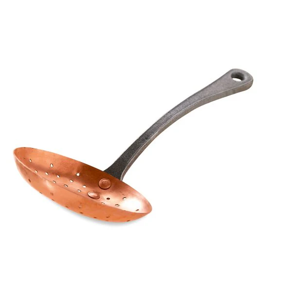 Cette écumoire, disponible avec un manche en fonte ou en inox. Opter pour une écumoire en cuivre, c’est non seulement perpétuer une tradition culinaire, mais aussi profiter des remarquables propriétés thermiques du cuivre, qui, grâce à sa conductivité thermique exceptionnelle, favorise une cuisson homogène et maîtrisée de vos préparations.