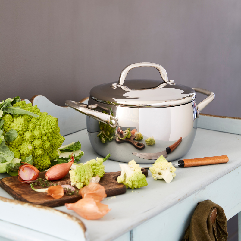 Le faitout possède un couvercle hermétique. Les poignées creuses restent froides pendant l’utilisation. La graduation intérieure permet un dosage précis. Il passe également au four jusqu’à 200°C. L’intérieur et l’extérieur sont polis miroir.