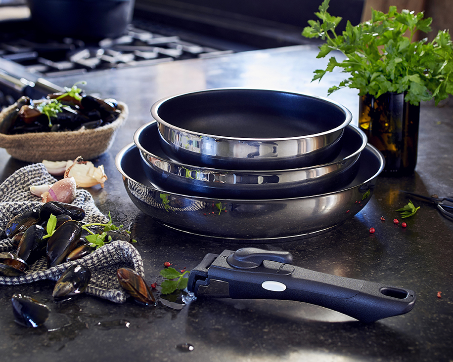 Série de 3 poêles à frire en inox avec revêtement anti-adhérent et manche amovible