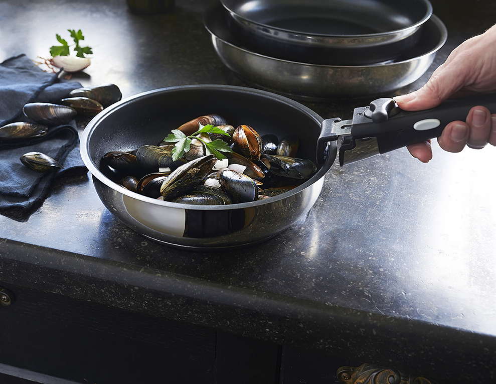 L’extérieur poli miroir apporte une touche de raffinement à votre batterie de cuisine, tandis que le manche amovible en bakélite noire offre une prise en main confortable, tout en vous permettant de gagner de la place dans vos placards ou votre lave-vaisselle.