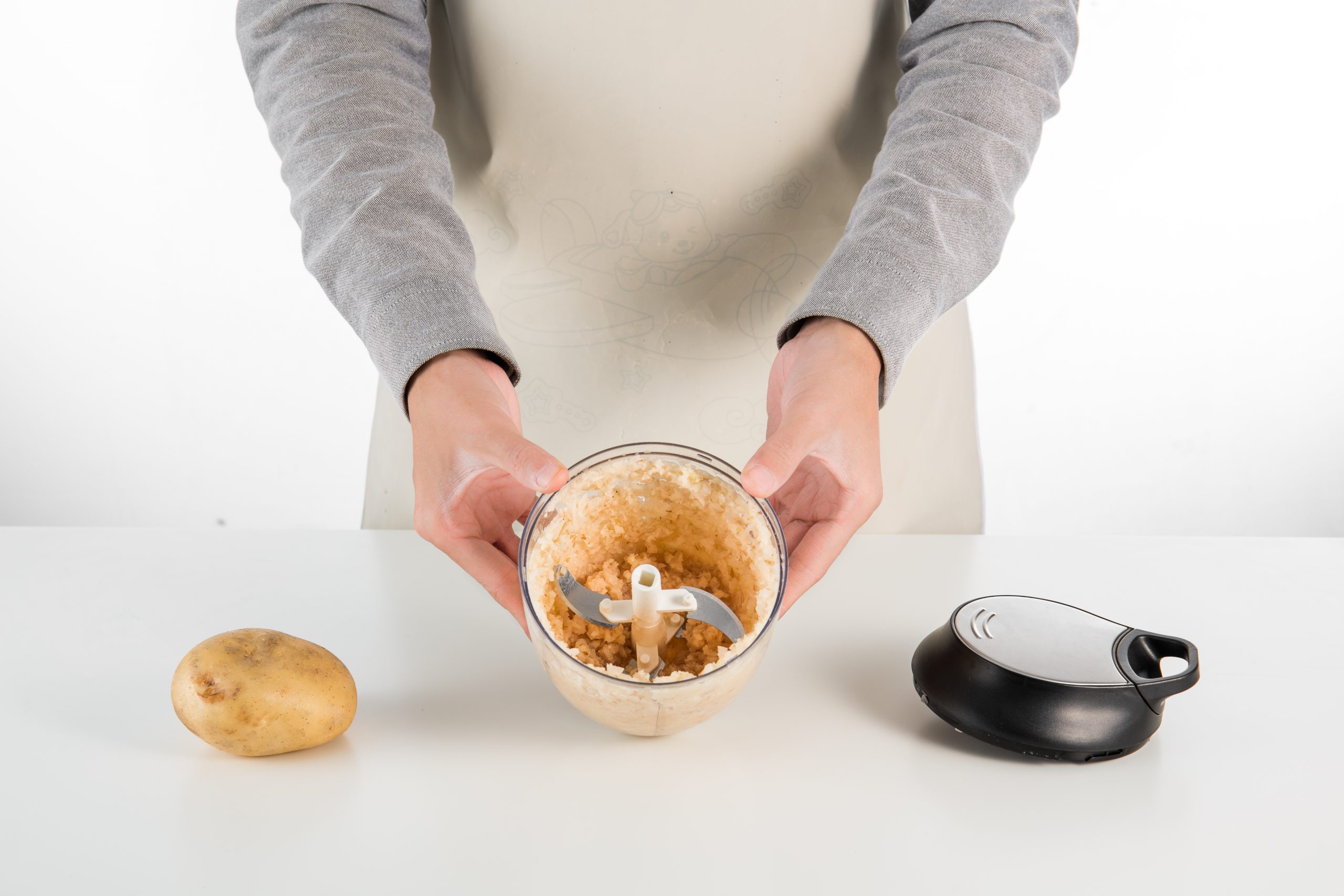 Il vous suffit de tirer sur la poignée pour hacher en un tour de main légumes, herbes, oignons et ail. Terminé, les odeurs sur les mains et les yeux qui pleurent. Il est doté de 5 lames en acier inoxydable et d’un couvercle en plastique de coloris noir.