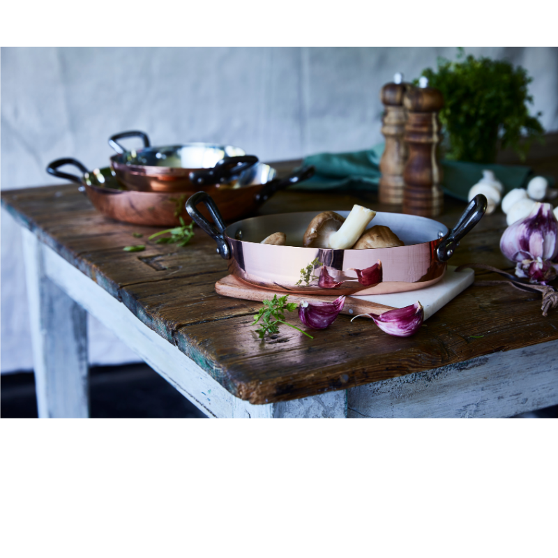 Caractéristiques | Plat à servir en cuivre étamé. Epaisseur 1, 7mm. Manche fonte. Tous feux sauf induction. |