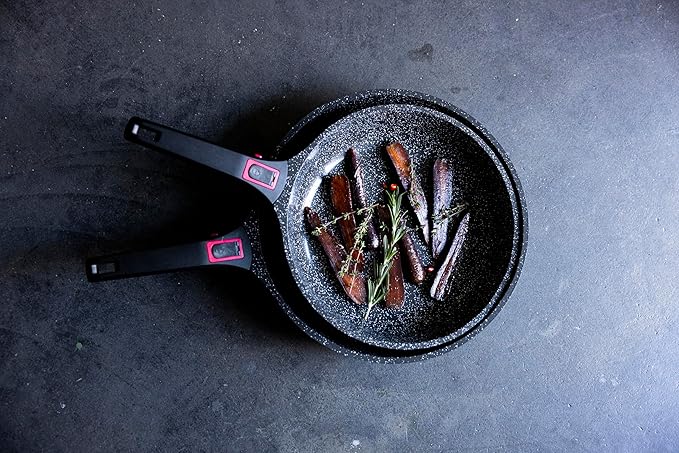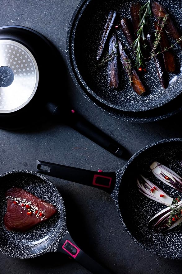 Son manche ergonomique amovible assure une prise en main confortable et sécurisée, tout en offrant un gain de place appréciable pour le rangement. Son extérieur noir effet pierre apporte une touche élégante à votre cuisine.