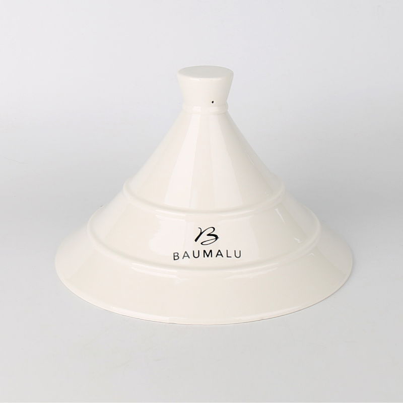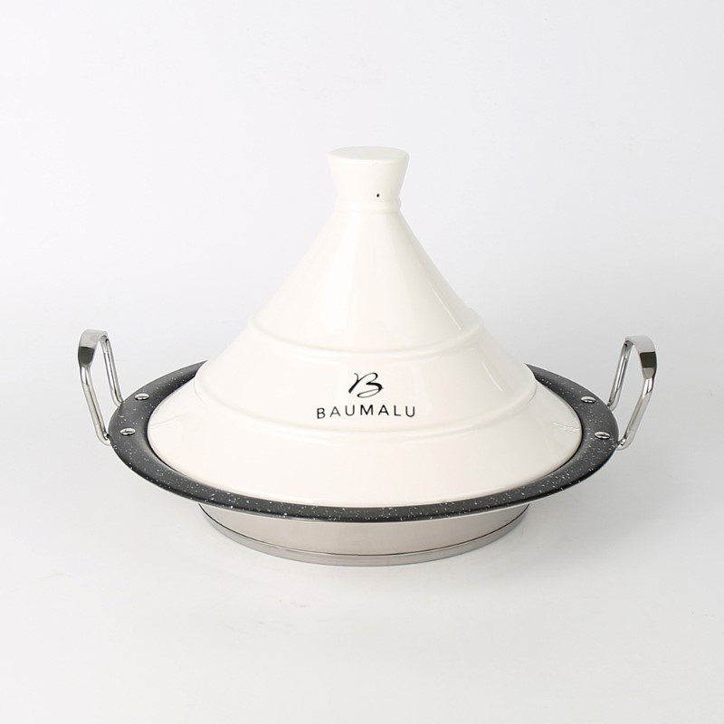 Le tajine est composé d’une base et d’anses en acier inoxydable et d’un couvercle en céramique blanche.